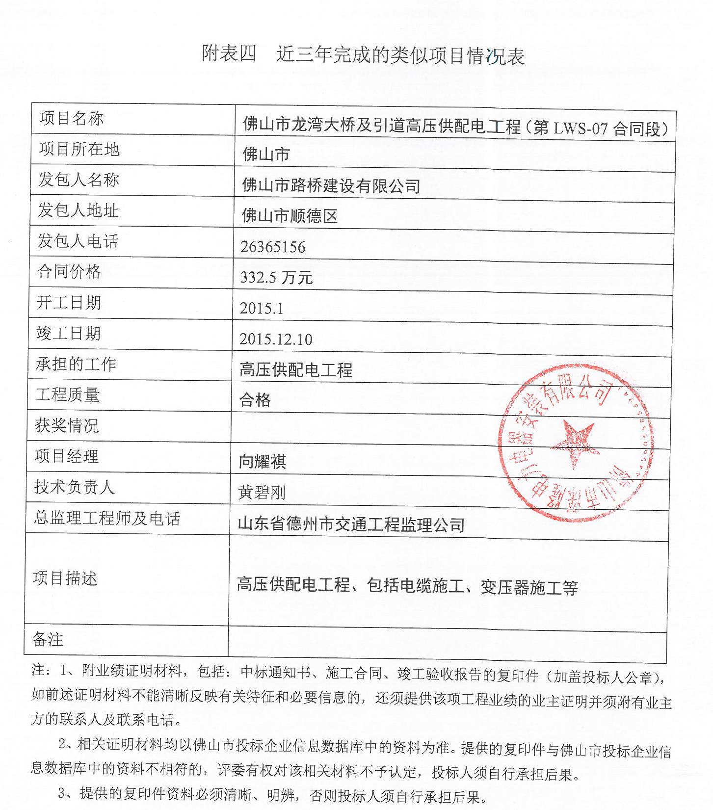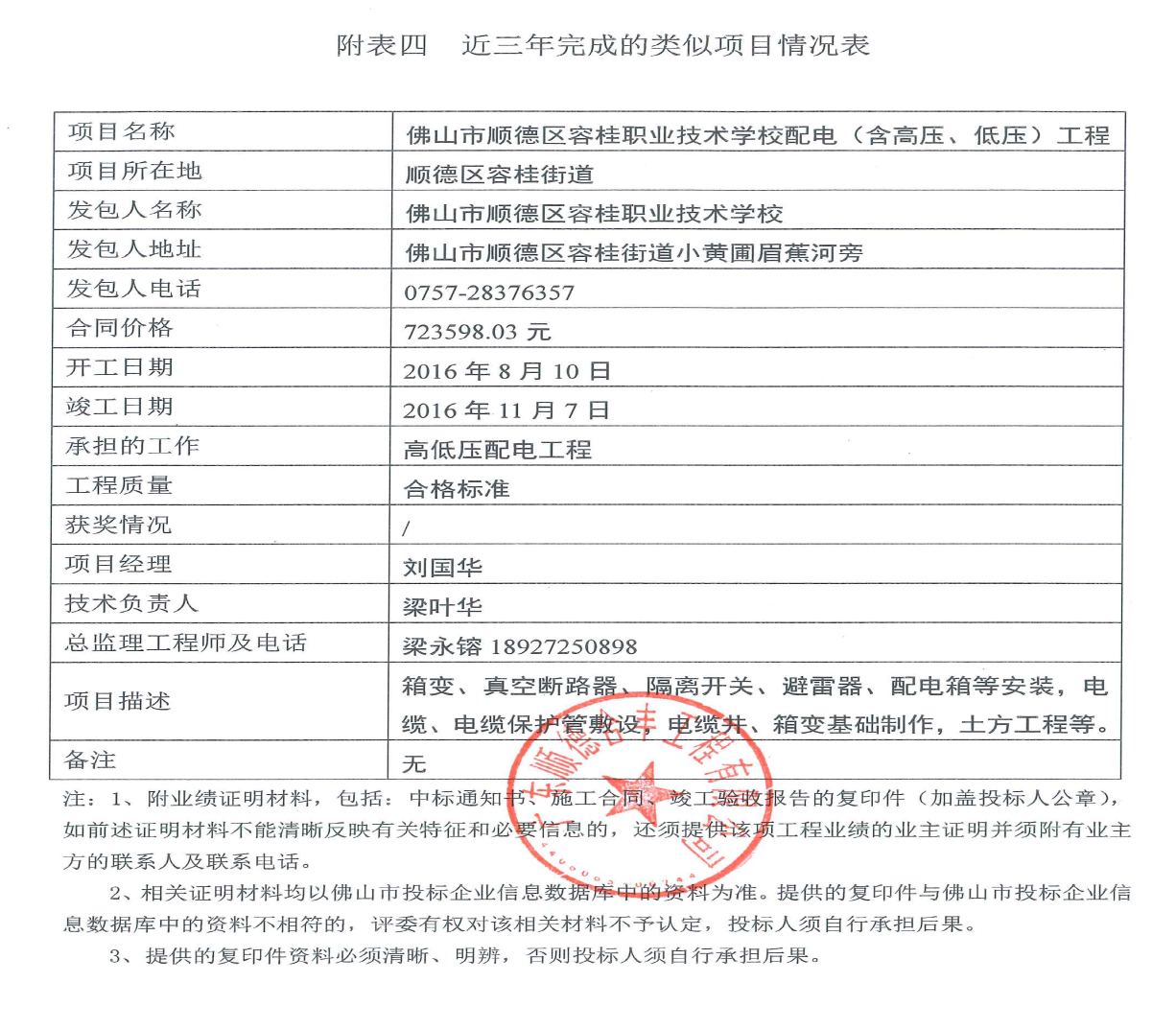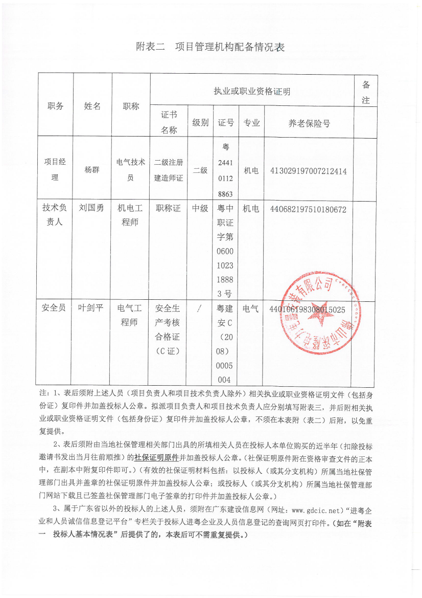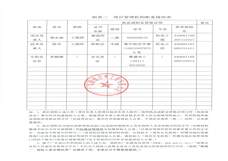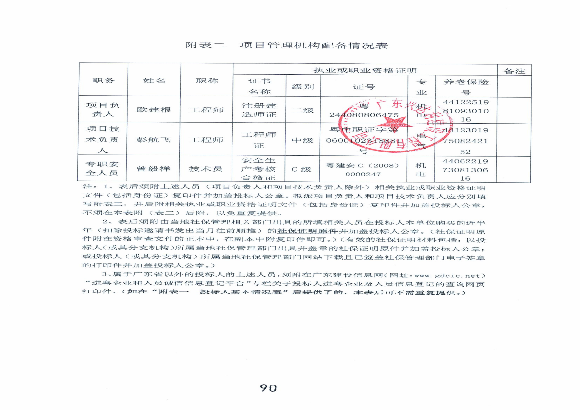 備注:中標(biāo)候選人投標(biāo)文件中的主要人員、業(yè)績、獲獎、信譽(yù)證明或其它需要公示的材料詳見附件 投標(biāo)主要人員表格 評標(biāo)結(jié)果公開附件 獲獎、信譽(yù)證明表格(如有) 投標(biāo)業(yè)績表格(如有) 附件: 第一中標(biāo)候選人: 廣東順德合豐工程有限公司 1、擬派本項(xiàng)目的項(xiàng)目負(fù)責(zé)人